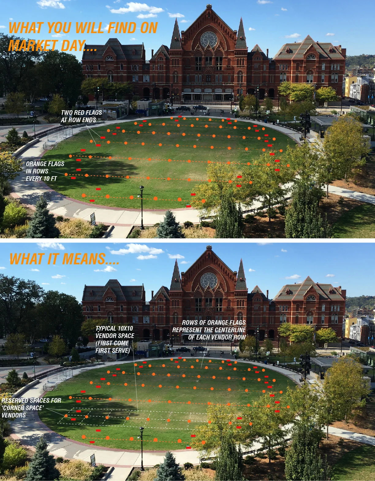 We arrive very early and try to have the lawn 'flagged off' by 7:15AM on market day. We ask vendors not to arrive before that time to allow for our setup process to happen uninterrupted and in a timely manner. So, if hypothetically you were the first vendor to arrive, here is what you'll see: