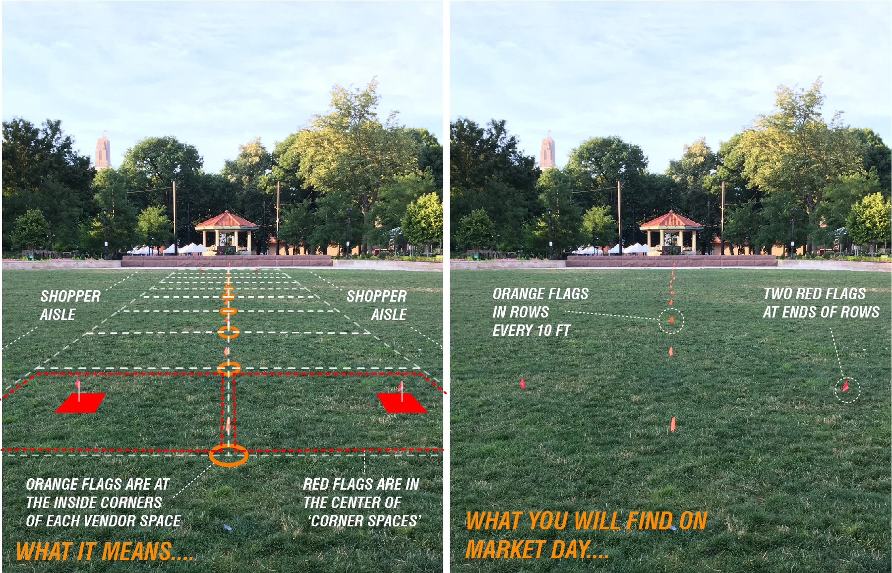 1) Don't align their tent within the parameters of the flags. As mentioned above, if you are setting up correctly, you will have your back two tent posts AT an orange flag. If you do that your tent will be parallel with the rest of the market, not encroaching on the walk aisle, and you are ready for another vendor to set up next to you properly.