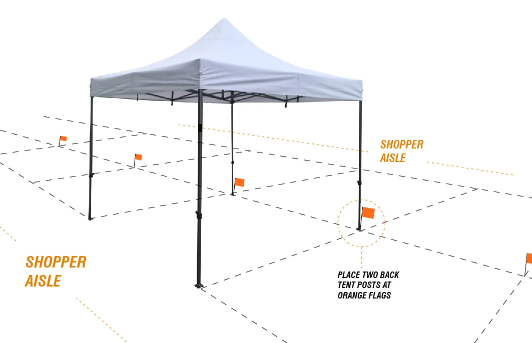 So we ask that you try to get your tent as tight to your next door neighbors as possible and have two of your four tent posts as close to an orange flag as possible. If you do those two things we will have straight and orderly rows as well as free and clear aisles for cash-carrying shoppers.